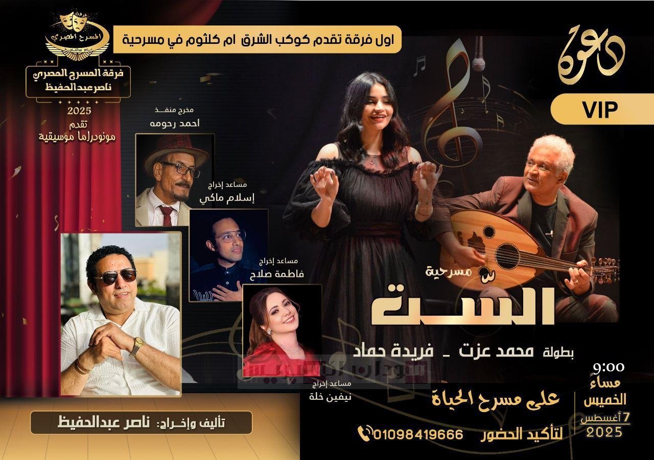 تُقدّم فرقة المسرح المصري عرضها المسرحي “الست” لأول مرة في مصر، مساء الخميس 7 أغسطس 2025، على خشبة مسرح الحياة بوسط القاهرة، ضمن فعاليات مشروع “المسرح الثري” بقيادة الفنان والمخرج ناصر عبد الحفيظ، وذلك بعد النجاح الكبير الذي حققته المسرحية في مونديال المسرح المغاربي بدولة ليبيا.