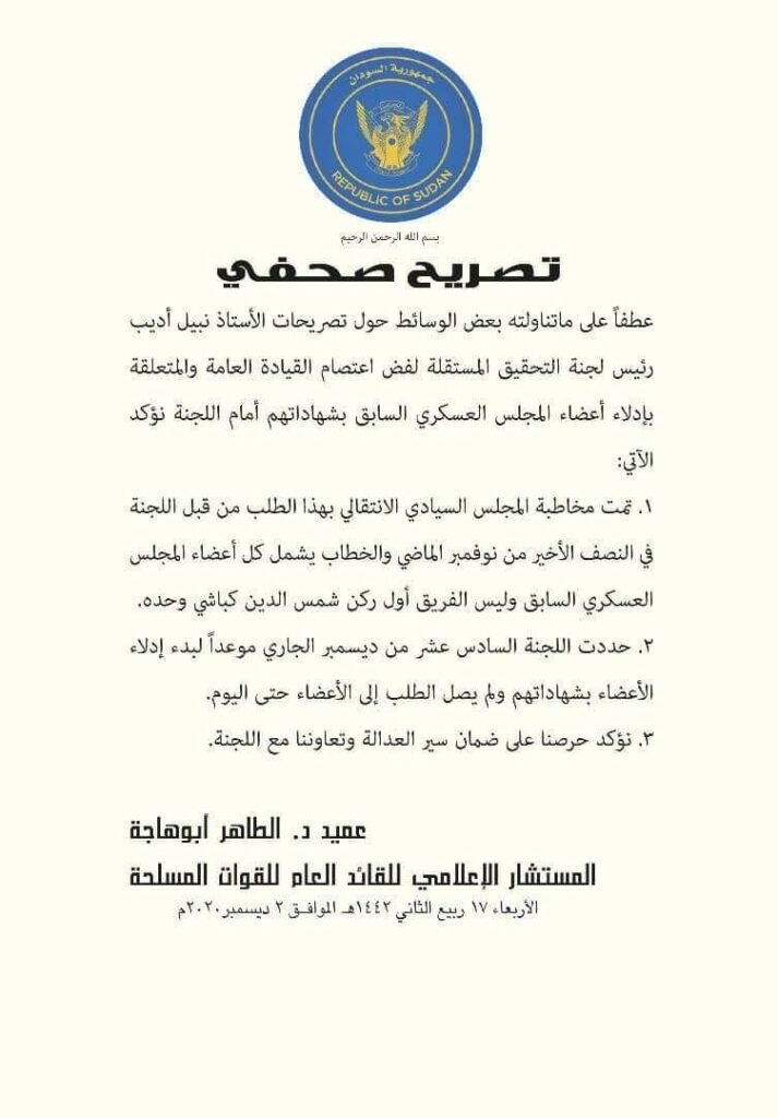 بيان للجيش حول لجنة “نبيل أديب” والتحقيق مع الكباشي ورفاقه أخبار سودان إكسبريس الانضمام لمجموعات سودان إكسبريس في واتساب