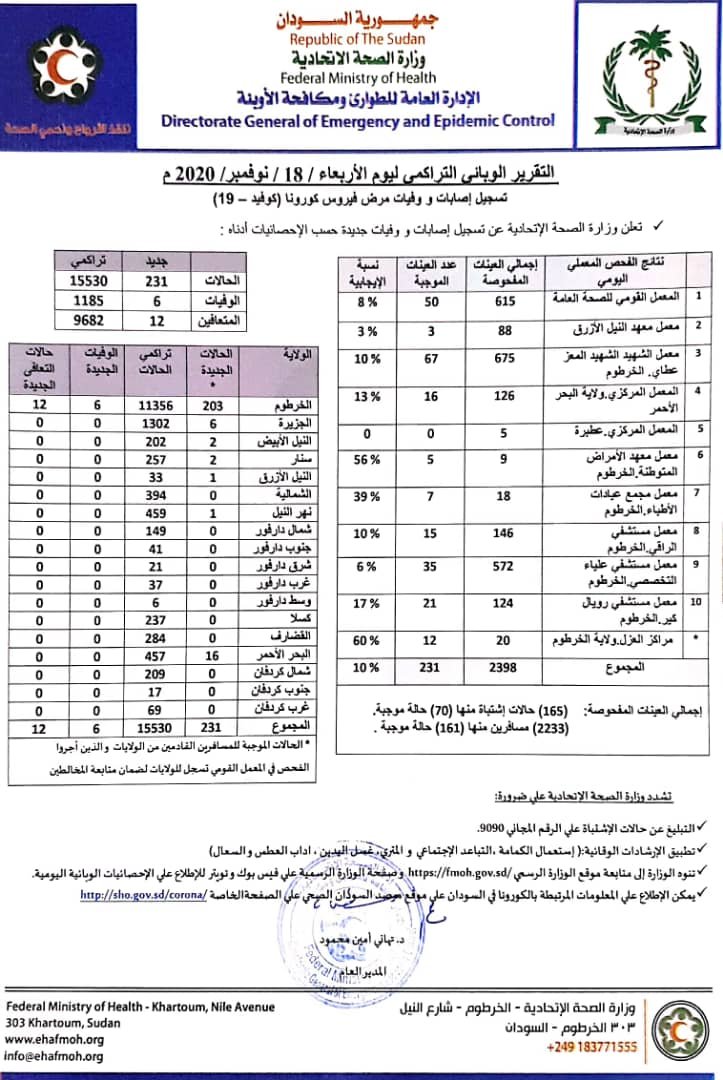 تقرير وزارة الصحة : 10% من فحوصات الأربعاء إيجابية لكورونا أخبار سودان إكسبريس الانضمام لمجموعات سودان إكسبريس في واتساب