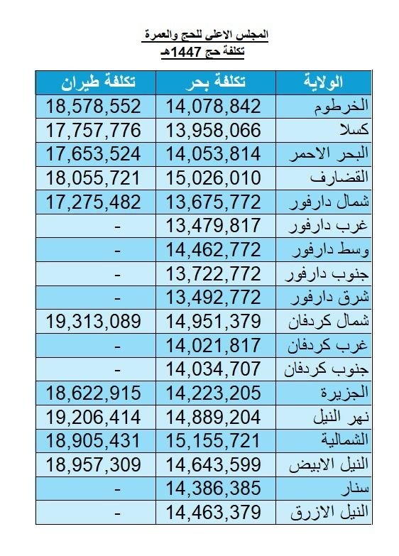 ويورد موقع سودان إكسبريس أدناه الجدول الرسمي لتكلفة الحج للعام 1447 هجرية / 2026 ميلادية لحجاج السودان: