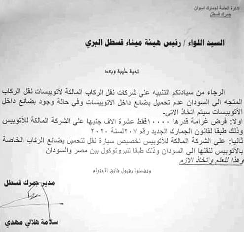 قررت السلطات المصرية منع بصات الركاب المتجهة من مصر إلى السودان من حمل البضائع، مطالبة شركات النقل بتخصيص عربة منفصلة لحمل البضائع طبقا للبروتوكول الموقع بين السودان ومصر. وقررت السلطات المصرية فرض غرامة 10 آلاف جنيه مصري على البص المخالف للقرار.