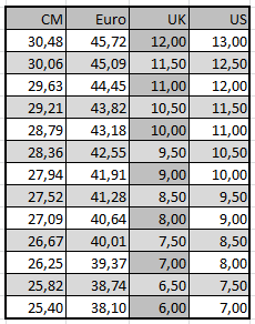 أما النظامان البريطاني والأمريكي فيستندان إلى وحدة قديمة تُسمّى “barleycorn”، أي ثلث بوصة، وتبدأ العدّة من مقياس مرجعي تعود أصوله إلى القرن التاسع عشر.