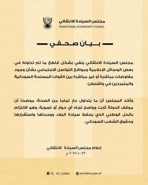 نفى مجلس السيادة الانتقالي بصورة قاطعة ما تم تداوله في بعض وسائل الإعلام ومواقع التواصل الاجتماعي حول وجود مفاوضات مباشرة أو غير مباشرة بين القوات المسلحة السودانية والمتمردين في العاصمة الأميركية واشنطن.
